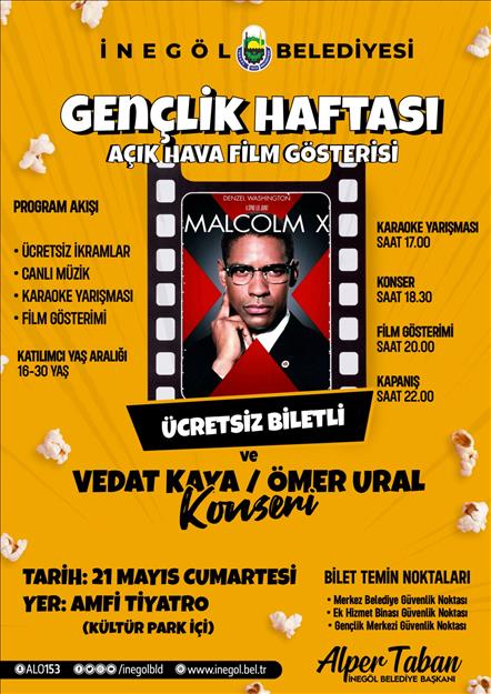 Hikmet Şahin Kültür Parkı içerisinde bulunan Amfi Tiyatroda yapılacak Gençlik Haftası Açık Hava Film Gösterisi, 17.00’da ikramlarla başlayacak. 16-30 yaş aralığındaki herkesin katılabileceği program karaoke yarışması ile start alacak. Ardından 18.30’da Vedat Kaya ile Ömer Ural konseri gerçekleştirilecek. 20.00’da Malcolm X film gösteriminin yapılacağı program, 22.00 itibariyle son bulacak.