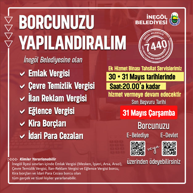 İnegöl Belediyesi, 7440 Sayılı Bazı Alacakların Yeniden Yapılandırılması Kanunu kapsamında vatandaşlara kolaylık sağlamak ve mağduriyet yaşanmasını önlemek adına son 2 gün mesai saatlerini uzattı. İnegöl Belediyesi’ne olan; emlak vergisi, çevre temizlik vergisi, ilan reklam vergisi, eğlence vergisi, kira borçları ve idari para cezalarını kapsayan yapılandırmadan faydalanmak isteyen vatandaşlar için tahsilat servisi mesai saatleri 20.00’a kadar uzatıldı. Belediye Ek Hizmet Binası tahsilat servisleri 30 ve 31 Mayıs tarihlerinde akşam 20.00’a kadar açık olacak ve vatandaşlara hizmet vermeye devam edecek.