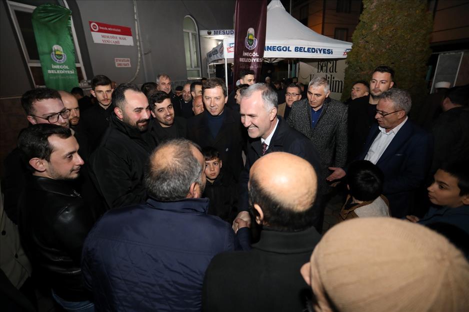Mesudiye Mahallesinde yatsı namazı çıkışında vatandaşlara salep ikramı yapılırken, Belediye Başkanı Alper Taban da beraberindeki AK Parti İnegöl İlçe Başkanı Mustafa Durmuş, Belediye Başkan Yardımcıları, AK Partili yöneticiler ve meclis üyeleriyle beraber burada vatandaşlarla bir araya geldi.