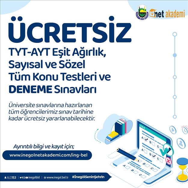 İnegöl Belediyesi ve İnegöl Net Akademi iş birliği ile hayata geçirilen proje kapsamında sisteme kayıt olan öğrenciler tüm ders konuları ile ilgili testlere ve deneme sınavlarına ücretsiz olarak erişim sağlayabilecek.