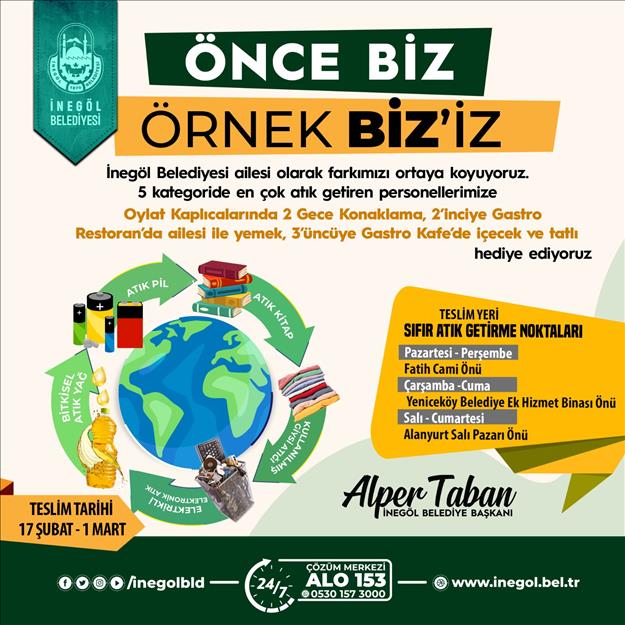 İnegöl Belediyesi sıfır atık uygulamaları kapsamında düzenlediği farkındalık etkinliklerine bir yenisini daha ekledi. Bu defa “Önce Biz, Örnek Biziz” sloganıyla personellerine yönelik bir yarışma düzenleyen İnegöl Belediyesi, 5 ayrı kategoride toplanacak atıklarla en fazla puan alan 3 personeli ödüllendirecek.