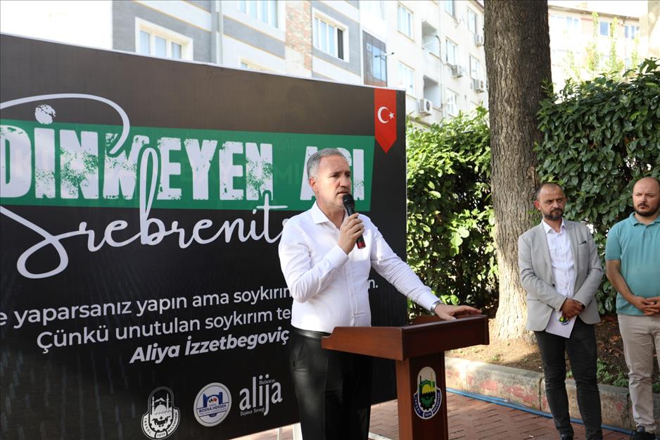 Uluslararası Aliya Düşünce Derneği Başkanı Ahmet Sert ise “Uluslararası Aliya Düşünce Derneği ve İnegöl Bosna Hersek Derneği ile İnegöl Belediyesi iş birliğinde bu anma programını gerçekleştiriyoruz. Bugün burada belki benzer şeyler ifade edeceğiz. Ancak amacımız da zaten bu. Yapılan soykırımı unutmamak ve unutturmamak… Oradaki durumun vahametini anlatabilmek için birkaç anekdot paylaşmak istiyorum. Bir anne, yavrusunu kucağına aldığında yaşanan kaotik devre o kadar dehşetliydi ki yavrusunu emzirirken korkudan onu öylesine sıkmıştı ki bir süre sonra evladının ruhunu teslim ettiğini fark etti. Koruma iç güdüsüyle sıktığı yavrusu kucağında can vermişti. Acı o kadar büyüktü. 8372 şehit olan kardeşimizi bugün bir kez daha rahmetle anıyoruz” diye konuştu.
