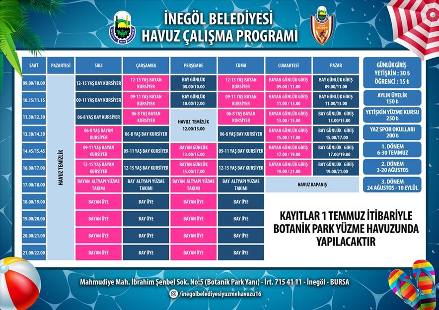 Temmuz ayında kısıtlamaların kaldırılmasıyla beraber İnegöl Belediyesi Yüzme Havuzu da yeniden hizmete giriyor. Spor İşleri Müdürlüğü organizasyonuyla 3 dönem şeklinde yapılacak yüzme kursu için kayıtlar 1 Temmuz Perşembe günü itibariyle alınmaya başlayacak. İlk dönem ise 6 Temmuz Salı günü yapılacak.