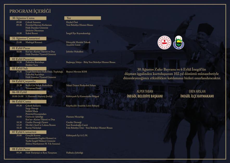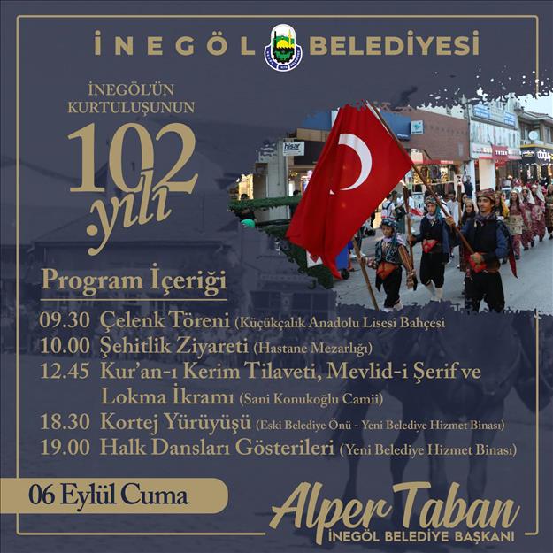 Zaferden Kurtuluşa etkinlikleri 6 Eylül Cuma sabahı İnegöl’ün düşman işgalinden kurtuluşunun 102. Yılı resmi törenleriyle devam edecek. 09.30’da Küçükçalık Anadolu Lisesi bahçesinde çelenk töreni yapılacak. Akabinde 10.00’da Garnizon Şehitliği ziyareti ve kuranı kerim tilaveti ile dualar edilecek. 10.30’da protokol üyeleri Gaziler Derneğini ziyaret edecek. Cuma günü 12.45’te ise Sani Konukoğlu Camisi mevlit okunacak ve Cuma namazı sonrası lokma ikramları yapılacak. Cuma günü 18.30’da Sani Konukoğlu Camisinden Atatürk Anıtına kadar kortej yürüyüşü, kortej sonrası da yeni belediye hizmet binası önünde halk dansları gösterileri yapılacak.