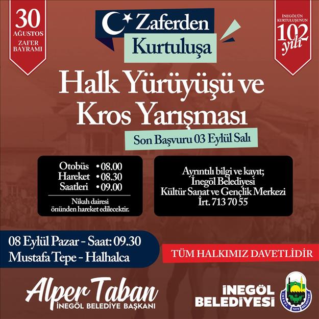 08 Eylül Pazar günü Zaferden Kurtuluşa etkinliklerinin finali son 2 yıldır olduğu gibi yine Halhalca Şehitliğinde yapılacak. 09.30’da Halhalca Şehitliğinde Kros Yarışması ve Halk Yürüyüşü olacak. Bu yıl 3’üncüsü yapılan geleneksel etkinlikte İnegöl’de Kurtuluş Savaşının en çetin mücadelesinin verildiği bölgede o günlerin anısına yürünecek. Kros ve yürüyüş bitiminde tüm katılımcılara simit ve çay ikramları yapılacak.