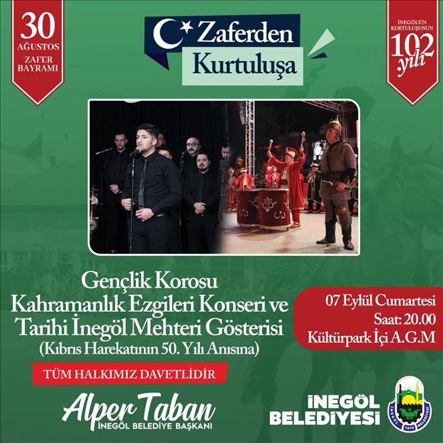 07 Eylül Cumartesi akşamı etkinlikler özel bir programla devam edecek. 20.00’da Amfi Tiyatroda Kıbrıs Harekatının 50. yılı anısına özel yapılacak etkinlikte İnegöl Belediyesi Gençlik Korosu “Kahramanlık Ezgileri” konseri gerçekleştirilecek. Koronun ardından ise Tarihi İnegöl Mehteri sahne alacak ve zaferden kurtuluşa programlarının coşkusuna coşku katacak.