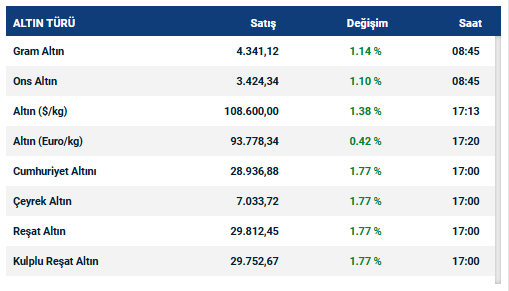 Gram altın güne 4285 liradan başladı. Gün içinde en düşük 4281 lira, en yüksek de 4371 lira seviyesi görüldü. Şu sıralar yüzde 1.4 oranında yükselişle 4346 liradan alıcı buluyor.