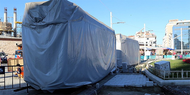 2 vagon Taksim Meydanı’na indirilirken, henüz yeni yapılan ve raylara yerleştirilmeyen 2 vagon da üzeri brandalarla kapatılmış şekilde bekletiliyor.