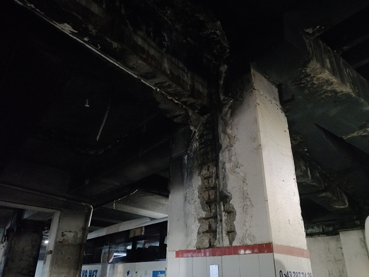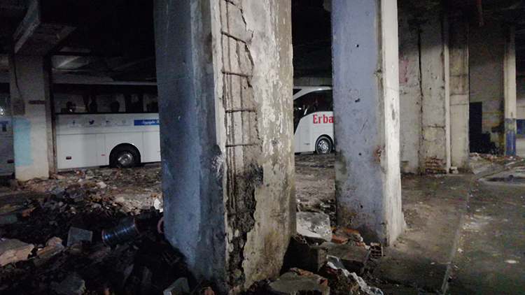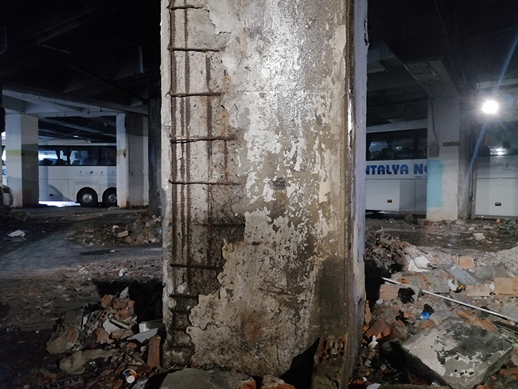 Esenler’de bulunan otogardaki birçok kolon ve kirişin sıvalarının döküldüğü, içerisinde bulunan demirlerin açığa çıktığı, bazılarının zamanla korozyona uğrayarak paslandığı görüldü.