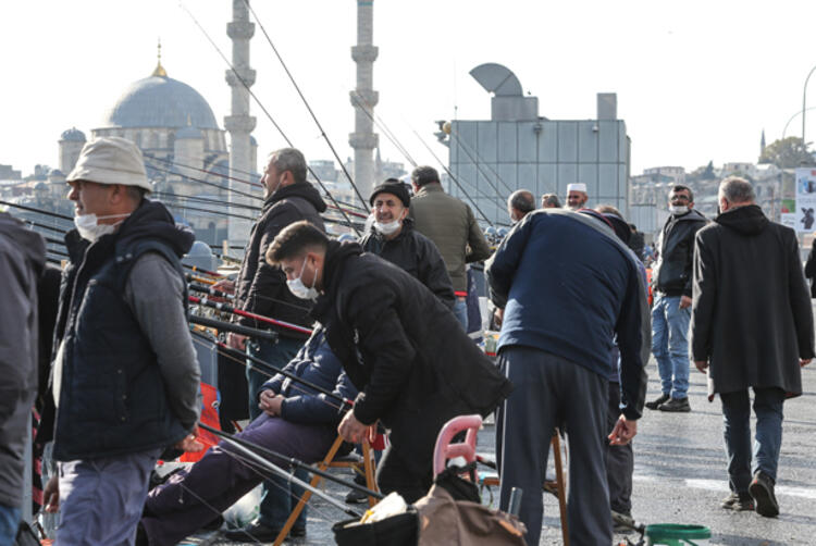 Galata Köprüsü üzerinde balık tutmaya gelen vatandaşların sosyal mesafe ve maske kuralına uymazken, köprü üzerindeki yoğunluk havadan görüntülendi.
