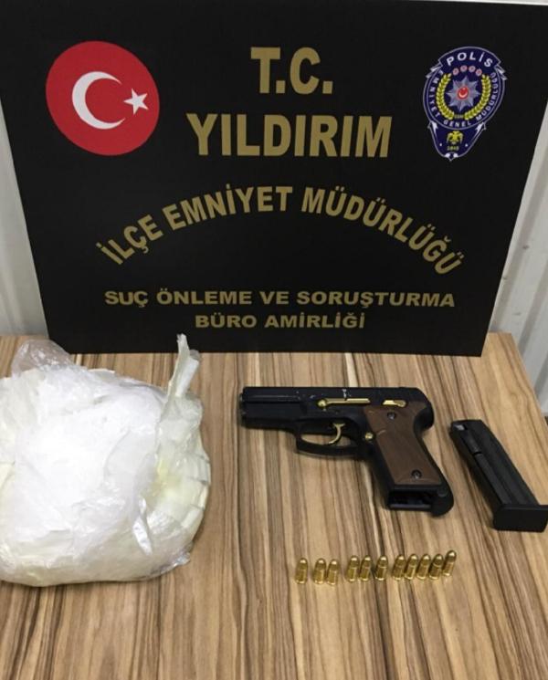 Yapılan aramada E.T.’nin üzerinde bir miktar uyuşturucu ve bir adet ruhsatsız tabanca bulundu. Ekiplerin takside yaptıkları aramada ise çanta içerisinde 738 gram metamfetamin ele geçirildi.