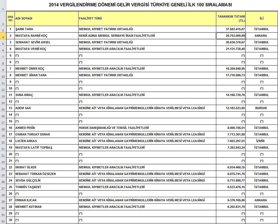 Maliye Bakanlığı Gelir İdaresi Başkanlığı, 2014 yılı vergilendirme dönemine ilişkin verilen Gelir Vergisi beyanları sonucunda Türkiye genelinde en çok vergi beyan eden ilk 100 mükellefi açıkladı.