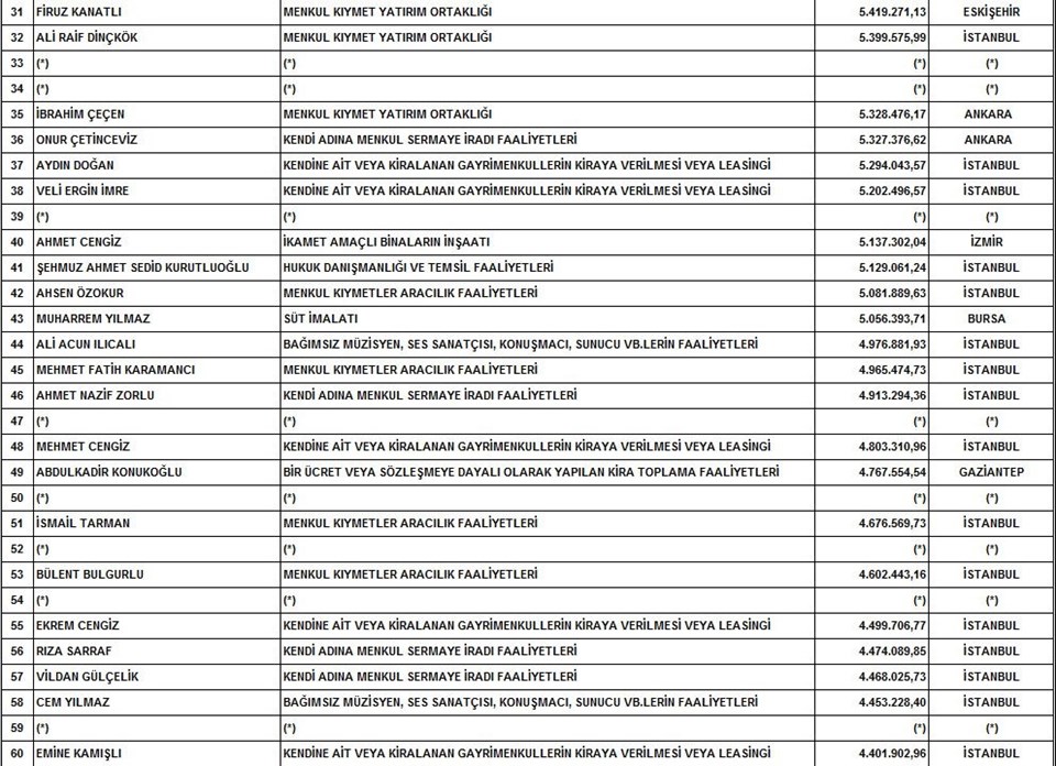 Aydın Doğan 5.294.043 TL ile 37. sırada, Acun Ilıcalı 4.976.881 TL ile 44. sırada. Ahmet Nazif Zorlu 4.913.294 TL ile 46., Mehmet Cengiz 4.803.310 TL ile 48., Abdulkadir Konukoğlu ise 4.767.554 TL ile 49. sırada yer aldı.