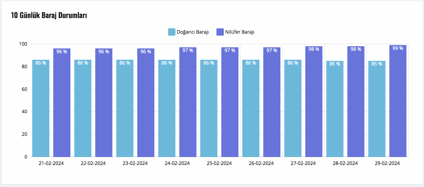 Bursa Büyükşehir Belediyesi Su ve Kanalizasyon İdaresi Genel Müdürlüğü’nün (BUSKİ) internet sitesindeki verilere göre; Doğancı Barajı’ndaki doluluk oranı yüzde 85, Nilüfer Barajı’nda doluluk oranı ise yüzde 99 olarak kaydedildi.