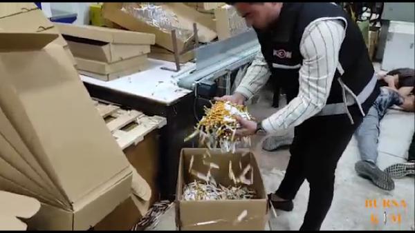 Kaçak sigara üretimi için 15 gün önce kurulduğu belirlenen fabrikada gözaltına alınan 15 kişinin emniyetteki işlemleri sürerken, İçişleri Bakanı Süleyman Soylu da Türkiye tarihine geçen operasyonu twitter hesabından paylaşarak, Bursa polisini tebrik etti. (DHA)