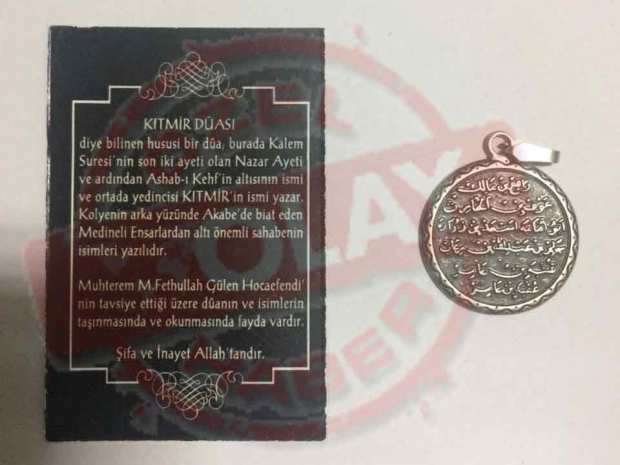 Hemşire olan G.G’nin evinde yapılan aramada, gümüş bir madalyonunun üzerinde Kuran-ı Kerim’de anlatılan Ashab-ı Kehf (Yedi uyurlar) cennetle müjdelenen KITMİR, isimli köpeğin ismi yazıldığı ardından ise 6 ismin sıralandığı gördü. Madalyonun yanında bulunan yazıda ise “KITMİR DUASI diye bilinen Kalem suresinin iki ayeti bulunmakta orta kısmında KITMİR yazar. Etrafında 6 uyurun isimleri bulunur. Muhterem Fetullah Gülen Hocaefendi’nin tavsiye ettiği üzere duanın ve isimlerin taşınmasında ve okunmasında fayda vardır” yazısı buldu. Hemşire G.G verdiği ifadede FETÖ içerisinde çok yararlılık gösteren ve mali kaynak sağlayan kişilere bir madalya gibi bu duaların dağıtıldığı bir hatıra olarak taşındığını anlattı.
