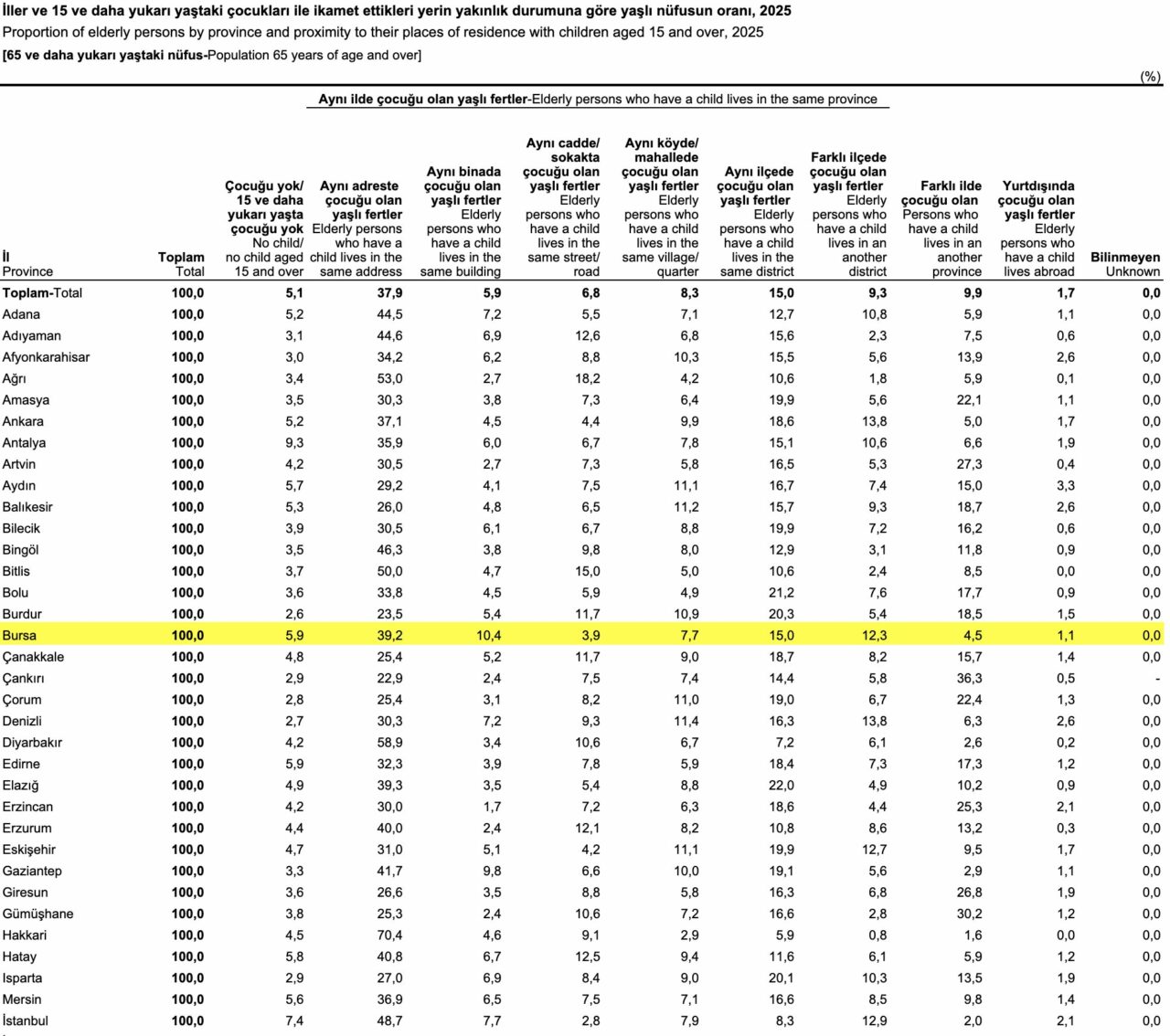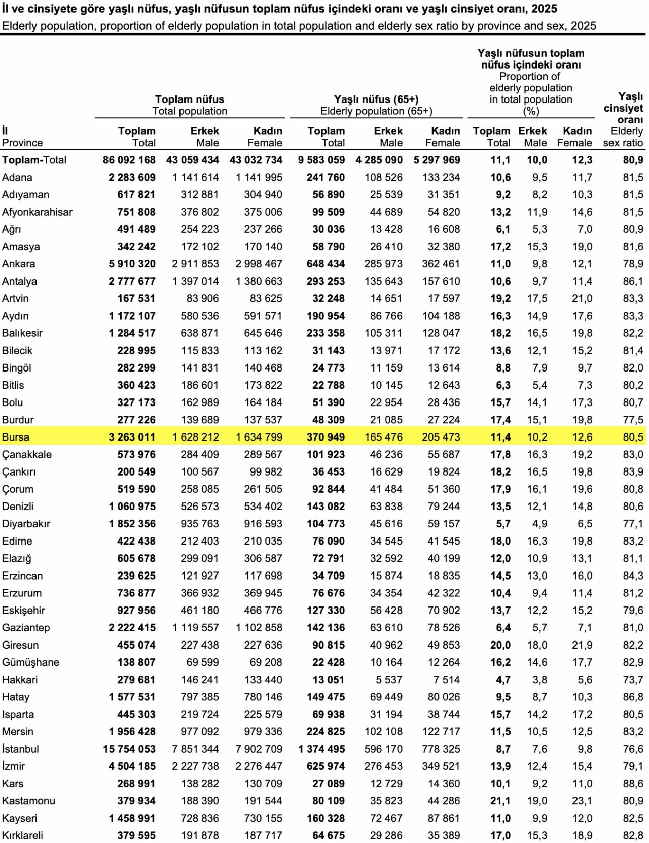 2025 yılında Bursa’da yaşlı nüfusun toplam nüfus içindeki oranı erkeklerde yüzde 10,2, kadınlarda yüzde 12,6 oldu.