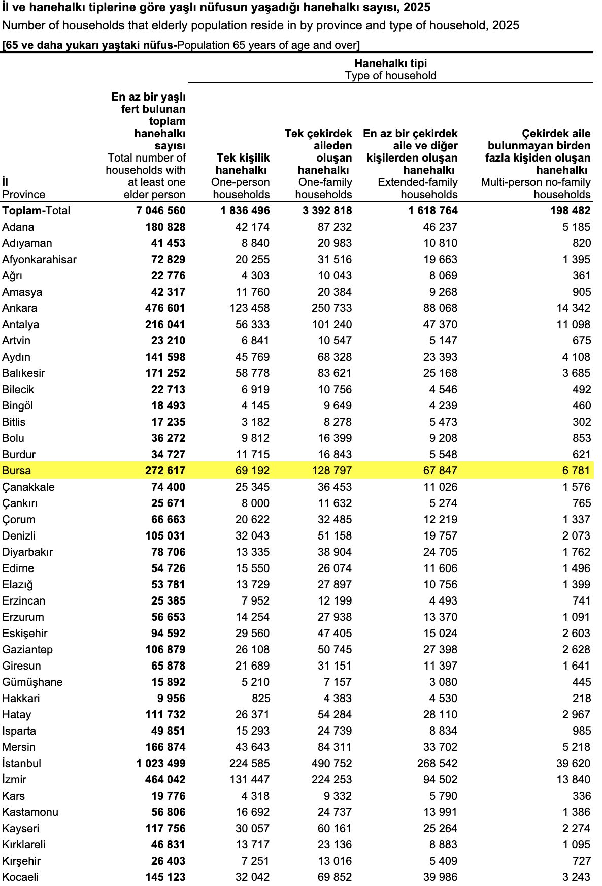 Bursa’da 2024 yılında 351 bin 288 olan yaşlı nüfusu 2025 yılında 370 bin 949 oldu…