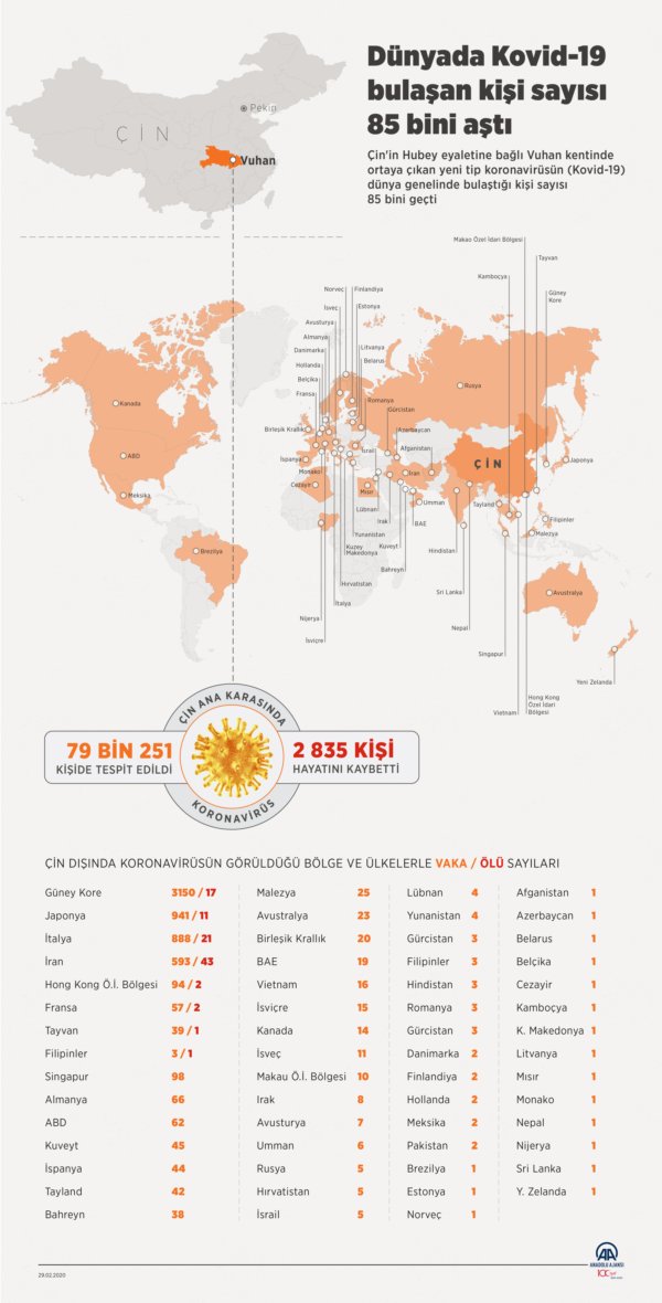 Ana Sayfa › Gündem › İşte ülke ülke koronavirüs… Korkunç tablo; 85 bini aştı…İşte ülke ülke koronavirüs… Korkunç tablo; 85 bini aştı… Çin’in Hubey eyaletine bağlı Vuhan kentinde ortaya çıkan yeni tip koronavirüsün (Kovid-19) dünya genelinde bulaştığı kişi sayısı 85’i bini geçti. Giriş: 29-02-2020 16:14Güncelleme: 29-02-2020 16:20Kaynak: GündemSağlık ABONE OL + - İşte koronavirüs haritası… Ülke ve rakamlar… HABERİ PAYLAŞ