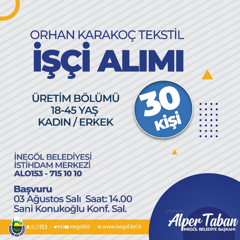 İnegöl Belediyesi İstihdam Merkezinden yapılan açıklamada, İnegöl OSB’de üretimini sürdüren Orhan Karakoç Tekstil firmasında çalışmak üzere personel alımı yapılacağı duyuruldu. Açıklamada şu ifadelere yer verildi: “İstihdam Merkezimizle işbirliği yapan Orhan Karakoç Tekstil firması; tekstil üretim tesisinde çalışmak üzere personel alımı yapacağını duyurdu. Firmada çalışmak üzere; 18-45 yaş arası bay ve bayan toplam 30 personel alımı yapılacak. Başvurular 03 Ağustos Salı günü 14.00’da Sani Konukoğlu Konferans Salonunda alınacak. Yapılacak alımla ilgili detaylı bilgi almak isteyen vatandaşlar 153 hatları üzerinden ve 0 224 715 10 10 Nolu telefondan İnegöl Belediyesi İstihdam Merkezine ulaşabilirler.”
