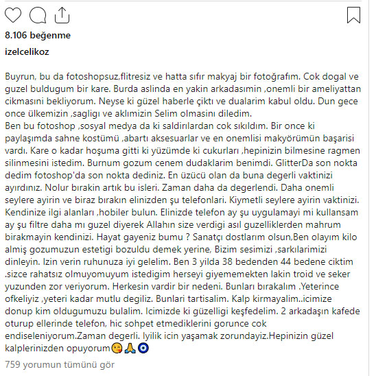 İzel filtresiz ve makyajsız bir karesini paylaşarak “Buyurun bu da photoshopsuz, filtresiz ve hatta sıfır makyaj bir fotoğrafım. Çok doğal ve güzel bulduğum bir kare. Burada aslında en yakın arkadaşımın, önemli bir ameliyattan çıkmasını bekliyorum. Neyse ki güzel haberle çıktı ve dualarım kabul oldu. Dün gece önce ülkemizin sağlığı ve aklımızın selim olmasını diledim. Ben bu photoshop, sosyal medyadaki saldırılardan çok sıkıldım. Bir önceki paylaşımda sahne kostümü, abartı aksesuarlar ve en önemlisi makyörümün başarısı vardı. Kare o kadar hoşuma gitti ki yüzümdeki çukurları, hepinizin bilmesine rağmen silinmesini istedim. Burnum, gözüm, çenem dudaklarım benimdi” ifadelerini kullandı.