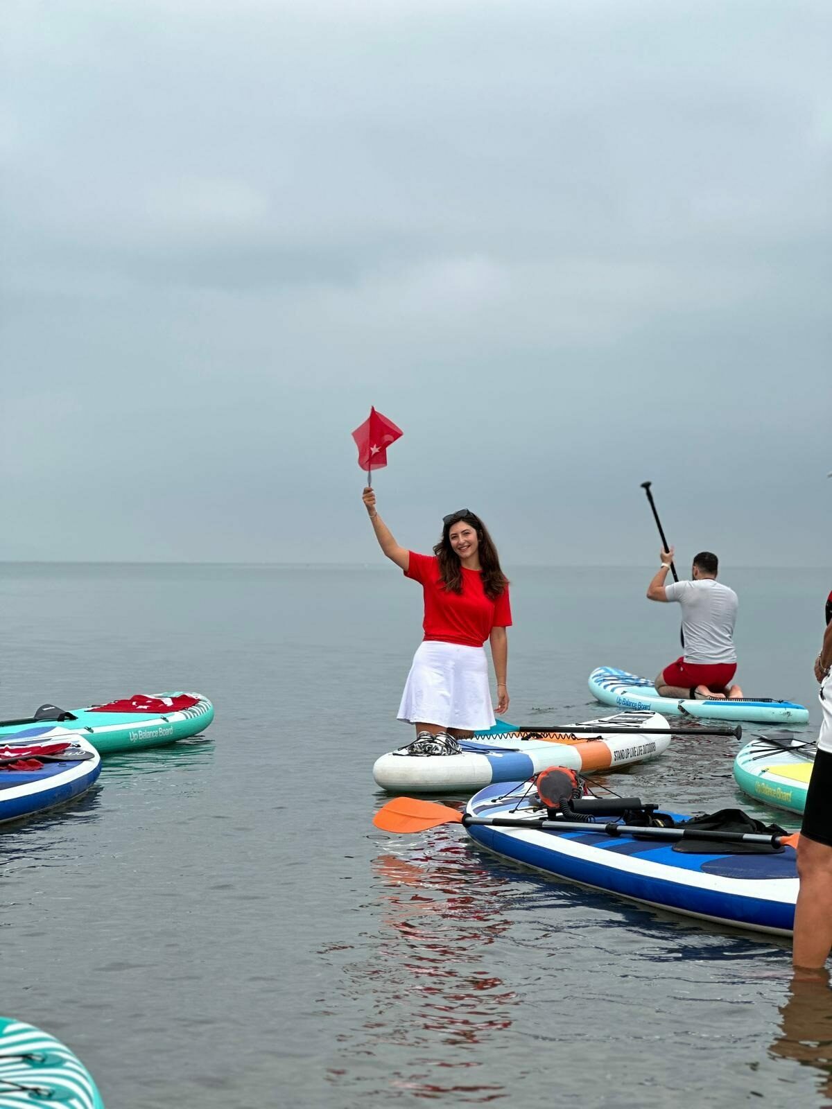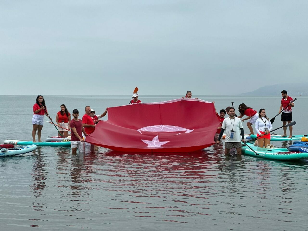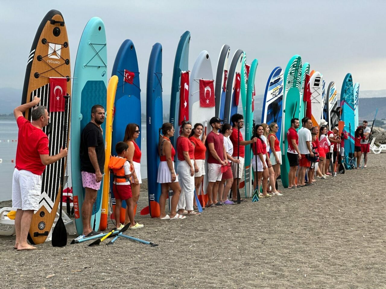 30 Ağustos Zafer Bayramı’nın 103’üncü yıl dönümü kutlamaları kapsamında İznik Gölü’nde bir araya gelen yaklaşık 20 kişilik Sup Board ekibi, göl üzerinde kırmızı-beyaz kıyafetlerle marşlar eşliğinde süzülerek renkli görüntüler oluşturdu. Dev Türk bayrağı açan grubu çevredekiler de ilgiyle izledi.