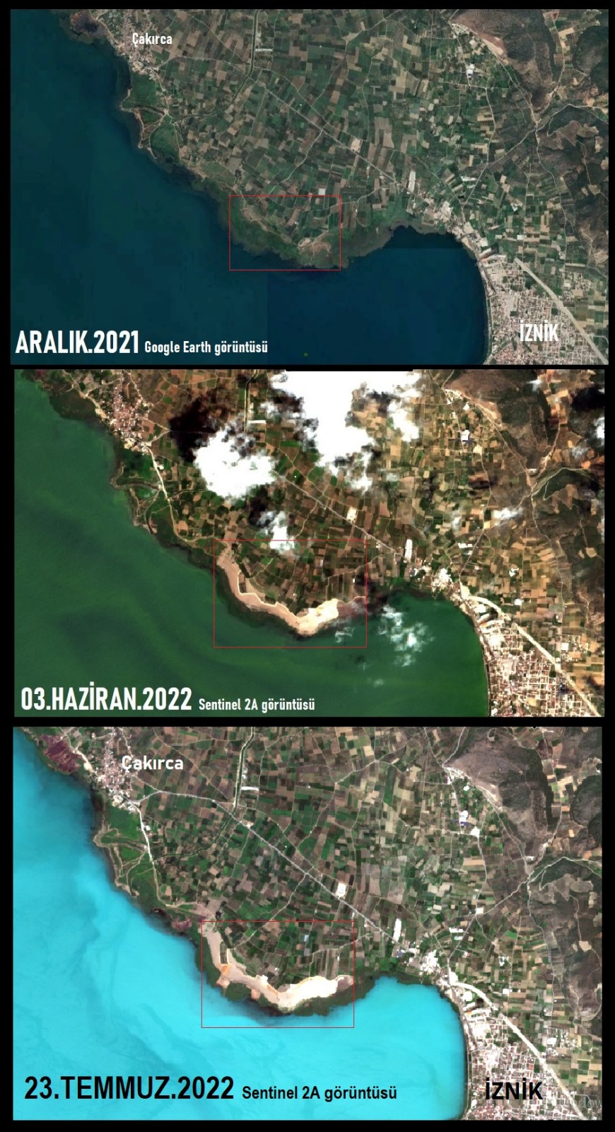 Uludağ Üniversitesi Ziraat Fakültesi Öğretim Üyesi Prof. Dr. Ertuğrul Aksoy, yaptığımız görüşmede, Aralık 2021’den Temmuz 2022’ye kadar geçen süreçte İznik Gölü’nün çevresindeki değişimi gözler önüne seren çarpıcı uydu görüntülerini paylaştı.