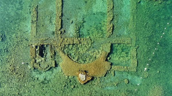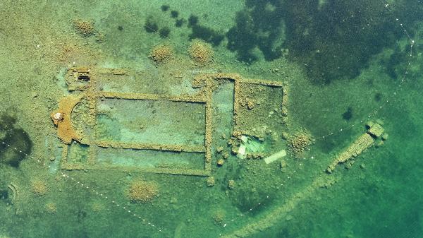 ‘Tarihi Kültürel Mirası Tespit ve Havadan Fotoğraflama Çalışmaları’nda çekilen görüntülerde fark edilen ve 740 yılındaki depremde çökmenin etkisiyle göl sularına gömülen bazilika, 2014 yılının en önemli keşifleri arasında gösterildi.