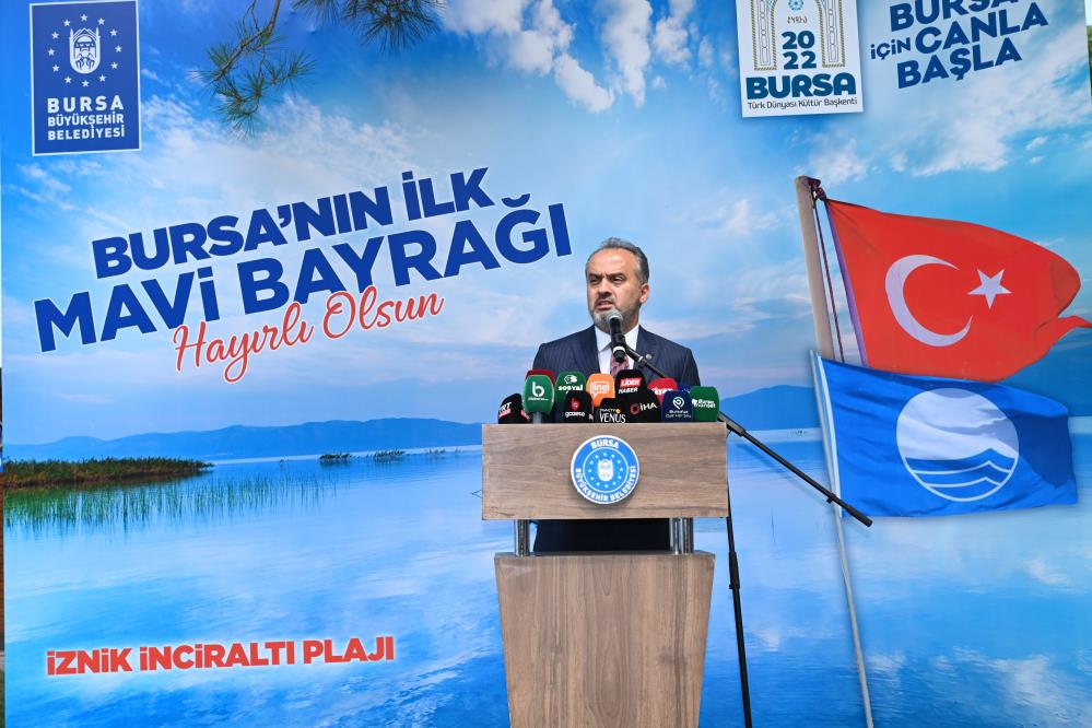Bursa Büyükşehir Belediye Başkanı Alinur Aktaş, tarih, turizm, sanayi ve tarım kenti olmanın yanında Bursa’nın 277 kilometrelik kıyı bandı ile aynı zamanda bir sahil kendi olduğunu söyledi. Sahile bu kadar kıyısı olup da bu kadar ekiple böyle yoğun bir çalışma yapan başka bir Büyükşehir Belediyesi olmadığını dile getiren Başkan Aktaş, “Marka olmanın belirli doneleri var. Marka olmak için markası tescillenmiş alanlarınızın olması lazım. Daha önce Türkiye Çevre Eğitim Vakfı’na bu konuda müracaat etmiştik. Birbirinden ayrı ve önemli 33 kriteri yerine getirdik ve yüksek kalite göstergesi olan mavi bayrak ödülünü almaya hak kazandık. Sürdürülebilir çevre yatırımlarımızla sadece İnciraltı Plajımız değil, bütün plajlarımıza Mavi Bayrak almayı arzu ediyoruz. Biz Mavi Bayrağı bir sembol olarak görüyoruz. Olaya kısa vadeli değil şu cennet şehri daha da güzelleştirmek adına daha uzun vadeli bakmak zorundayız. Hayırlı, uğurlu olmasını temenni ediyorum” dedi.