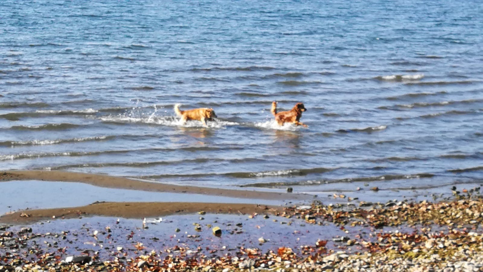 Bomboş İznik Gölü sahilinde oyunlar oynayan sokak köpekleri, göle girip yüzdü. O anlar renkli görüntüler oluşturdu. (İHA)