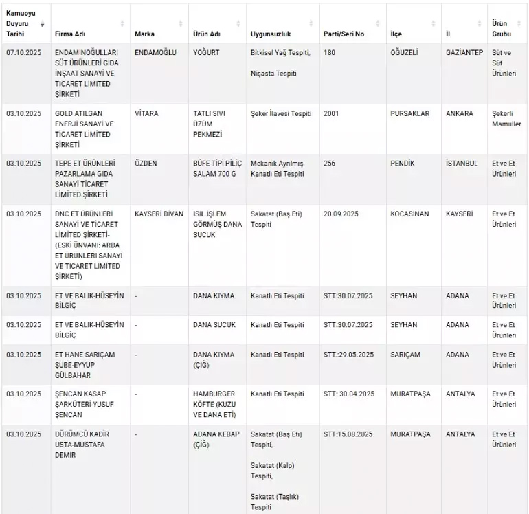 Listeye toplam 24 yeni ürün daha eklendi. Listede, peynir tereyağı ve yoğurt ürünleri eklendi. Buna göre, belirlenen peynir ve tereyağı ürünlerinin yağ oranlarının düşük olduğu belirlendi, Gaziantep Oğuzeli ilçesinde faaliyet yürüten bir firmanın yoğurdunda bitkisel yağ ve nişasta tespit edildi. (DHA)