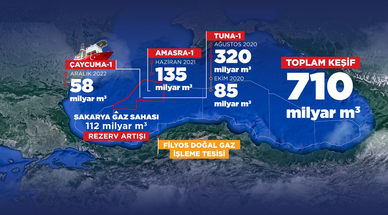 Fatih sondaj gemisi, Karadeniz’de Çaycuma-1 kuyusunda 58 milyar metreküplük yeni bir doğalgaz rezervi keşfetti.