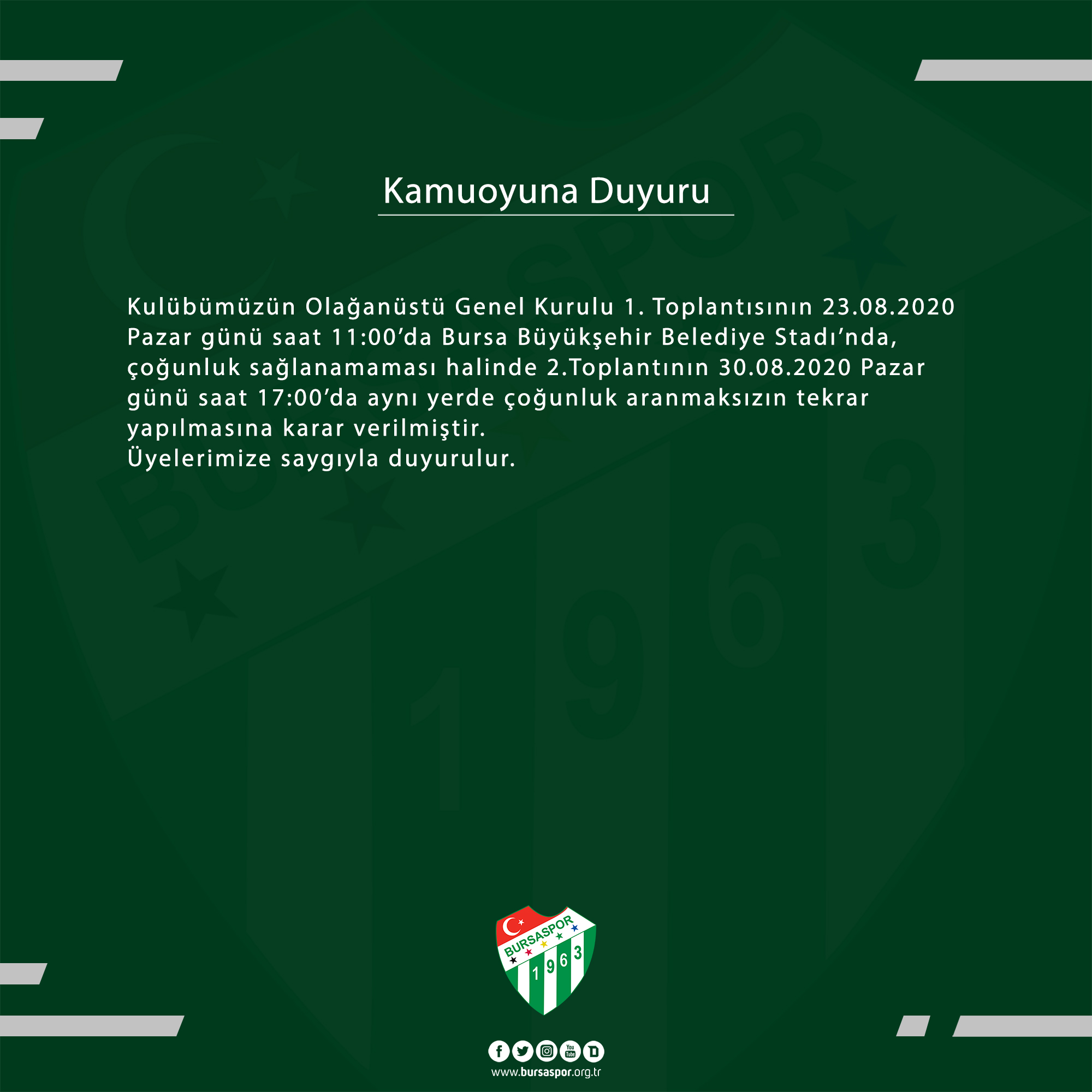 Bursaspor Kulübü’nün olağanüstü genel kurulunda 1’inci toplantı 23 Ağustos Pazar günü saat 11.00’de Bursa Büyükşehir Belediye Stadyumu’nda gerçekleştirilecek. Çoğunluk sağlanamaması halinde ise 2’nci toplantı 30 Ağustos Pazar günü saat 17.00’de yine stadyumda, bu kez çoğunluk aranmaksızın yapılacak.