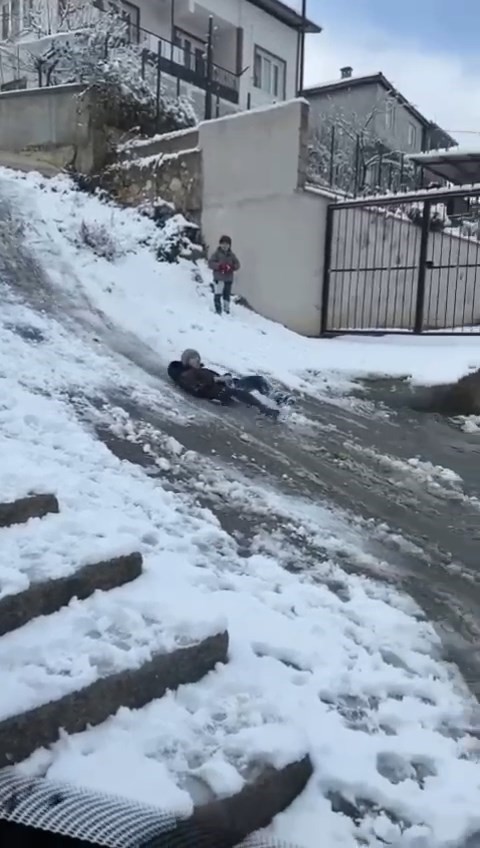 Kar yağışına hazırlıksız yakalanan sürücüler zor anlar yaşarken çocuklar ise bu durumu fırsata çevirdi. Evlerinden aldıkları poşetlerle sokaklara akın eden çocuklar kayarak karın tadını çıkardı.