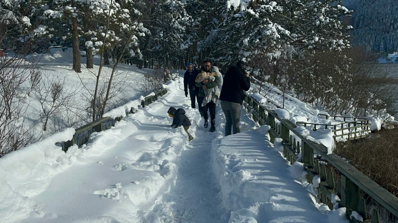 Tatil için Abant’a gelenler, soğuk havaya rağmen göl çevresinde yürüyüş yapıp manzaranın tadını çıkardı.