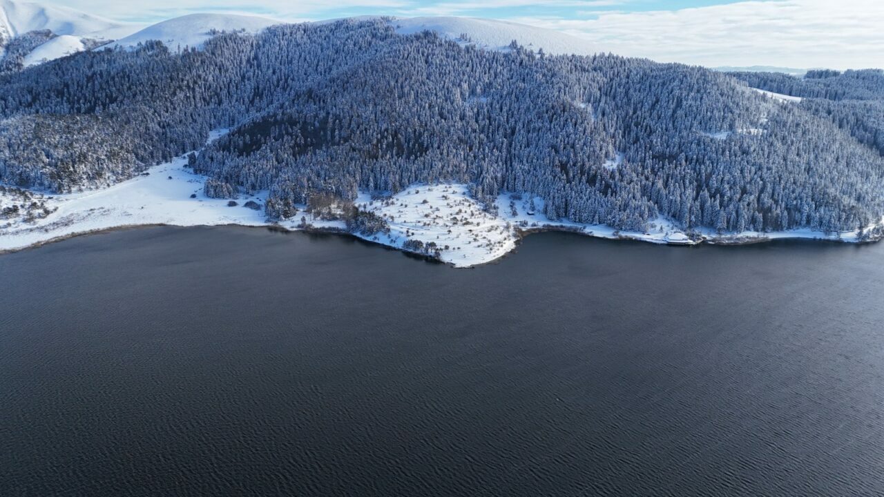 Beyaz örtüye bürünen Abant Gölü Milli Parkı’nın eşsiz manzarası dron ile görüntülendi. (DHA)