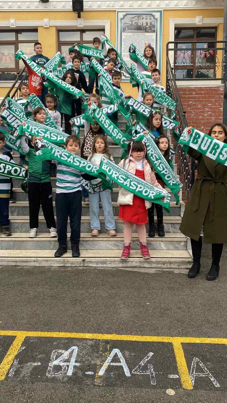 Bursaspor atkılarıyla poz veren öğrenciler, takımlarının bu sezonu da zirvede tamamlayıp Süper Lig yolunda emin adımlarla yürüyeceğine inanıyor.