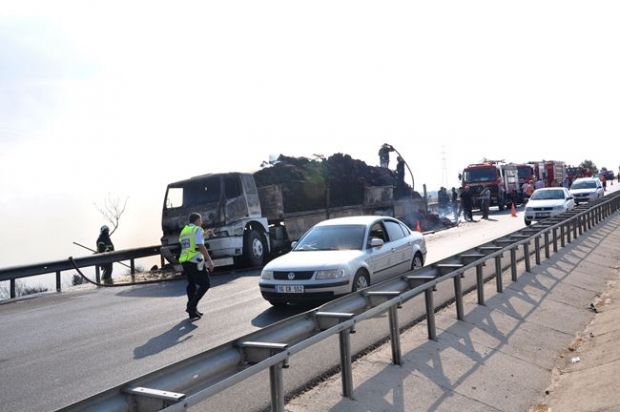 Bursa’daki tavuk çiftliklerine yumurta kolisi taşıyan Hüseyin Keskin, dün kamyonuyla Bandırma’dan yola çıktı. Saat 16.30’da Karacabey’in İkizce Mahallesi’ne geldiğinde dumanların yükseldiğini fark eden sürücü hemen durdu.