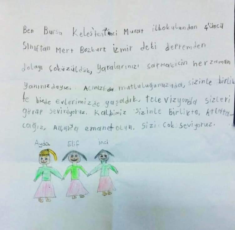 Keles 1. Murat İlkokulu 4. sınıf öğrencisi Mert Bozkurt’un zarfın içerisine koyduğu harçlıklarının yanı sıra arkadaşlarına göndermiş olduğu destek mektubu, okuyanları duygulandıracak cinsten. Ayda, Elif ve İnci’ye hitaben yazdığı mektupta depreme çok üzüldüğünü belirten ilkokul öğrencisi Mert Bozkurt, arkadaşlarına “kalbimiz sizinle” diyerek adeta tüm Türkiye’ye tercüman olmuş.