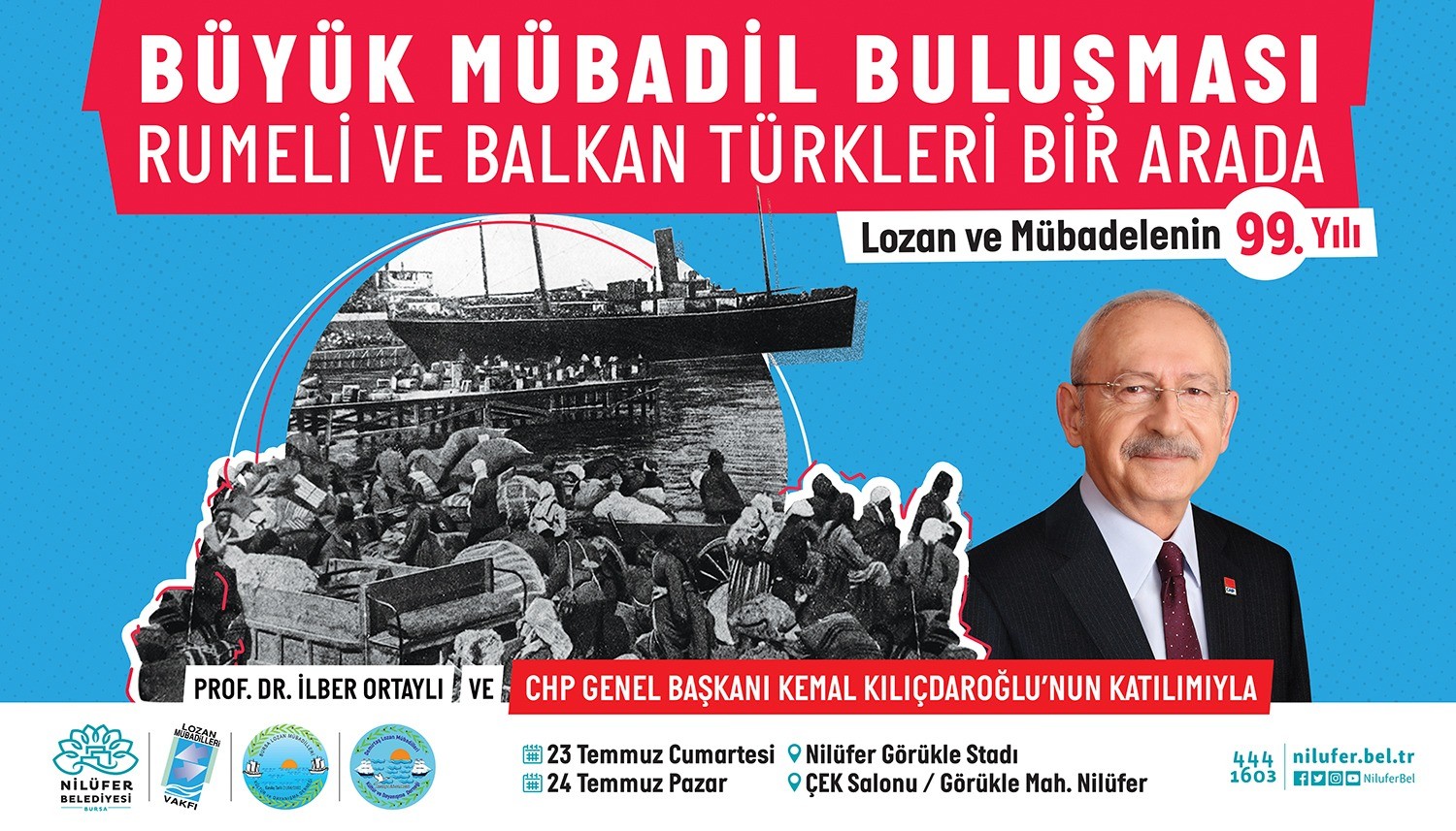Lozan Barış Antlaşması’nın 99. yılı sebebiyle, bu yıl Bursa’da mübadillerin yoğun olarak yaşadığı bölge olan Görükle’de CHP Genel Başkanı Kemal Kılıçdaroğlu’nun katılımı ile çeşitli etkinlikler gerçekleştirilecek. ’Büyük Mübadil Buluşması – Rumeli ve Balkan Türkleri Bir Arada’ etkinlikleri, Nilüfer Belediyesi, Lozan Mübadilleri Vakfı, Bursa Lozan Mübadilleri Kültür ve Dayanışma Derneği, Demirtaş Lozan Mübadilleri Kültür ve Dayanışma Derneği iş birliği ve CHP Genel Merkez Balkan Masası’nın koordinasyonu ile 23-24 Temmuz’da gerçekleşecek. Buluşmaya Bursa’daki mübadillerin yanı sıra, Rumeli ve Balkan Derneklerinin yönetici ve üyeleri ile Türkiye’de faaliyet gösteren mübadil kuruluşlarının yönetici ve üyeleri de katılacak.