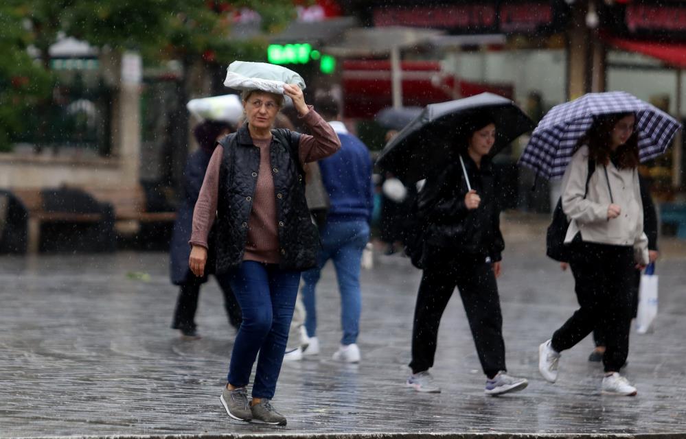 Osmangazi ilçesi 15 Temmuz Demokrasi Meydanı’nda yağmura şemsiyesiz yakalanan vatandaşlar koşarak sığınacak yer aradı.