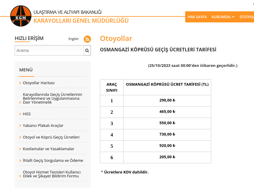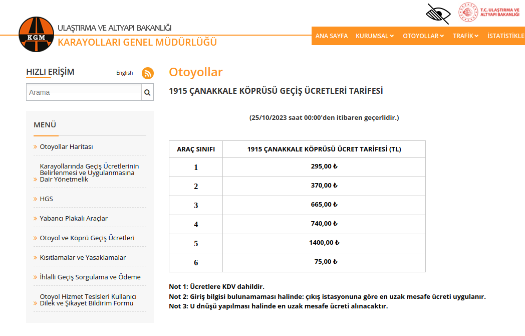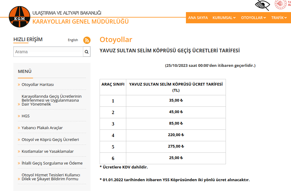 Karayolları Genel Müdürlüğü, “Otoyol ve köprü ücretleri, 25 Ekim 2023 Çarşamba günü saat 00.00’dan itibaren geçerli olmak üzere yeniden düzenlenmiştir” açıklamasıyla ücretlere zam geldiğini duyurdu.