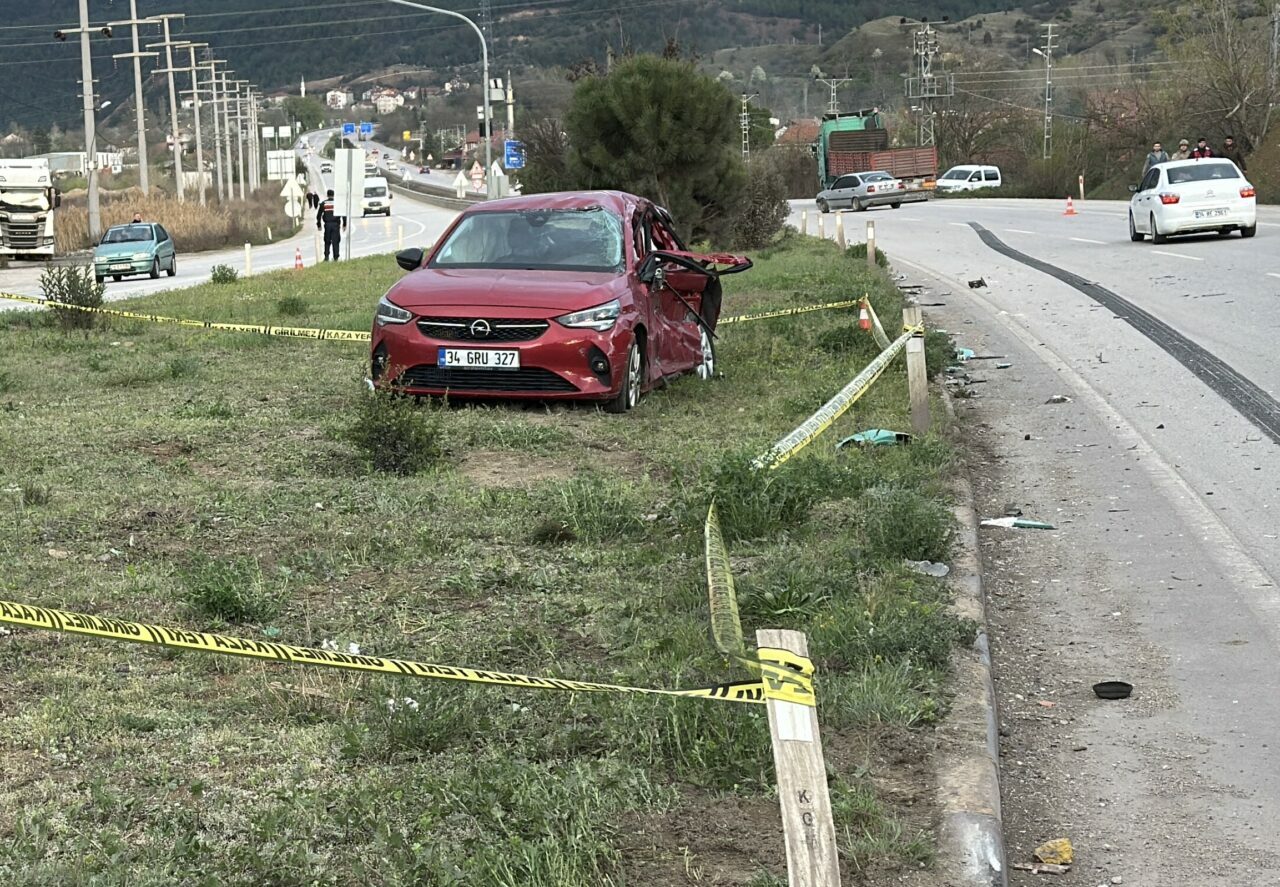Çarpışmanın etkisiyle yoldan çıkan otomobil refüje savruldu.