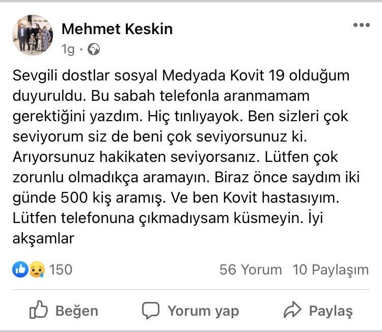 Başkan Keskin, “Sevgili dostlar, sosyal medyada Covid-19 olduğum duyuruldu. Bu sabah telefonla aranmamam gerektiğini yazdım. Hiç tınlayan yok. Ben sizleri çok seviyorum, siz de beni çok seviyorsunuz ki arıyorsunuz. Hakikaten seviyorsanız, lütfen çok zorunlu olmadıkça aramayın. Biraz önce saydım iki günde 500 kişi aramış. Ve ben Covid-19 hastasıyım. Lütfen telefonunuza çıkmadıysam küsmeyin” diye yazdı.