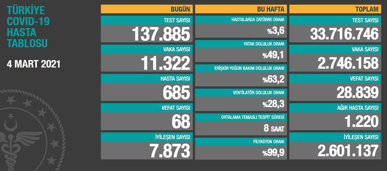 Türkiye’de son 24 saatte 137 bin 885 Kovid-19 testi yapıldı, 11 bin 322 kişinin testi pozitif çıktı, 68 kişi hayatını kaybetti.
