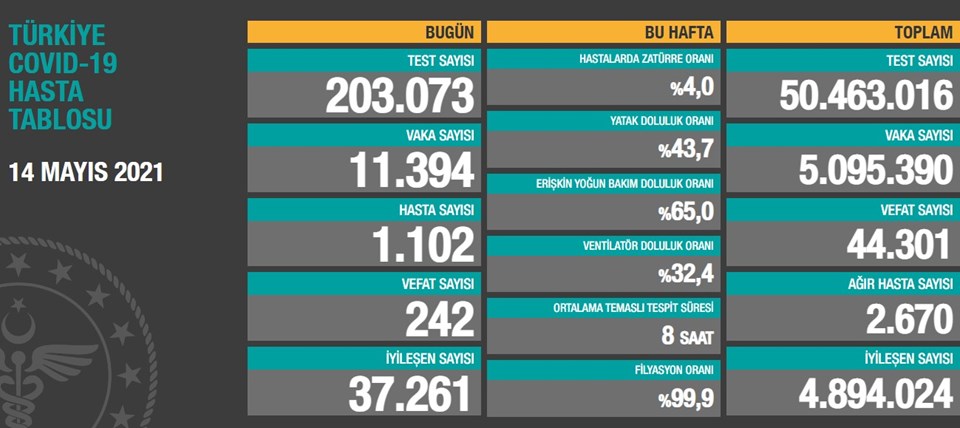 Haftalık verilere göre, bu hafta hastalarda zatürre oranı yüzde 4, yatak doluluk oranı yüzde 43,7, erişkin yoğun bakım doluluk oranı yüzde 65, ventilatör doluluk oranı yüzde 32,4, ortalama temaslı tespit süresi 8 saat, filyasyon oranı yüzde 99,9 olarak kayda geçti.