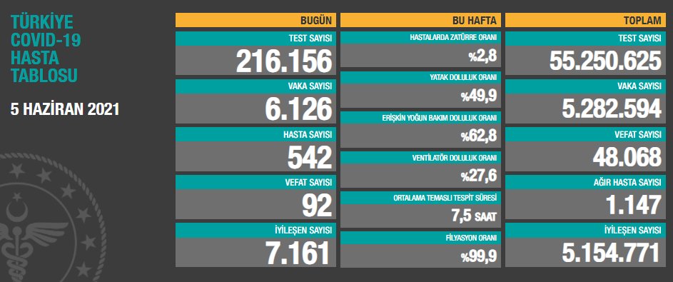 Ağır hasta 1147 oldu, 7 bin 161 kişinin Kovid-19 tedavisinin/karantinasının sona ermesiyle iyileşen sayısı 5 milyon 154 bin 771’e yükseldi.