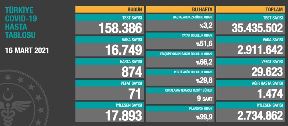 Buna göre, son 24 saatte 158 bin 386 Covid-19 testi yapıldı, 16 bin 749 kişinin Covid-19 testi pozitif çıktı, 71 kişi yaşamını yitirdi, hasta sayısı 874 oldu.