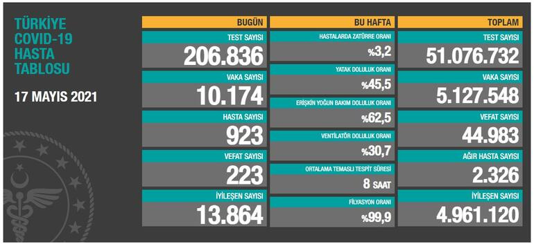 Türkiye’de son 24 saatte 206 bin 836 Kovid-19 testi yapıldı, 10 bin 174 kişinin testi pozitif çıktı, 223 kişi hayatını kaybetti.