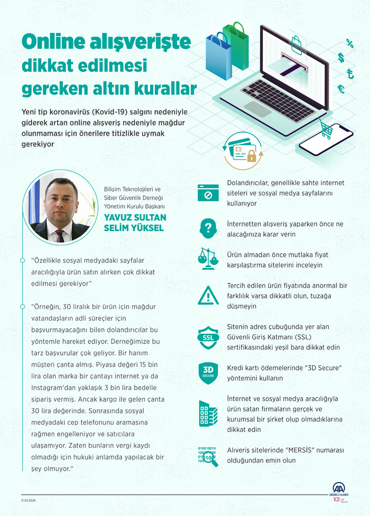 Bilişim Teknolojileri ve Siber Güvenlik Derneği Yönetim Kurulu Başkanı Yavuz Sultan Selim Yüksel, AA muhabirine yaptığı açıklamada, koronavirüs nedeniyle internetten alışverişlerde büyük artış yaşandığını, bu tür işlemlere alışkın olmayan insanların bile artık sağlık gerekçesiyle online alışveriş yapmaya başladığını söyledi.